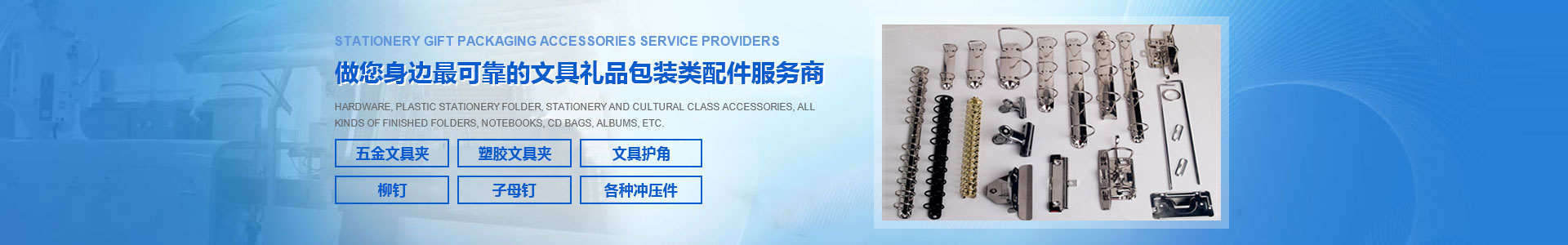 深圳市协和兴五金塑胶制品厂创建于一九九八年,位于中国的重要经济地区珠三角,多年来致力于文具礼品包装类配件的研发与 生产,是业内知名专业厂家之一,主营产品:各类规格的五金文具夹、塑胶文具夹、快劳夹、各种附属装订配件、账本钉、护角 、空心钉、双/单面撞钉。产品款式新颖、工艺精湛、品种据不同的需求加工定制,工厂引进国外先进生产设备和拥有经验丰富 的高素质的专业技术人员,并长期致力开发新产品,拥有专利产品20多种。